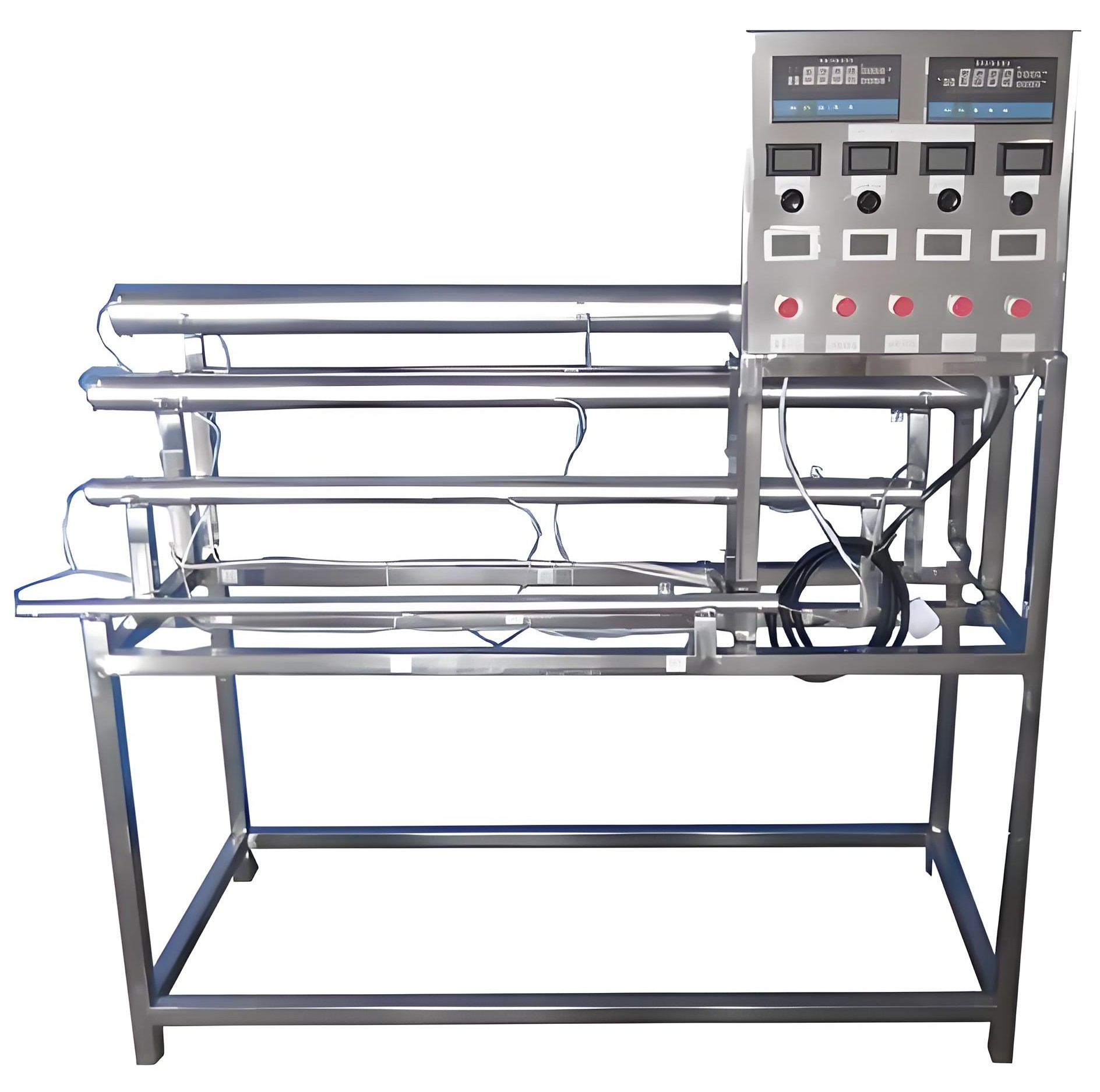 不同長度和直徑的電鍍紫銅管四根,管內(nèi)設(shè)置加熱器,固態(tài)調(diào)壓模塊無極調(diào)節(jié)加熱,測溫傳感器,電功率測試數(shù)顯儀表,萬能信號輸入巡檢儀顯示溫度,各管配有溫度控制儀表,不銹鋼臺架及控制屏等。